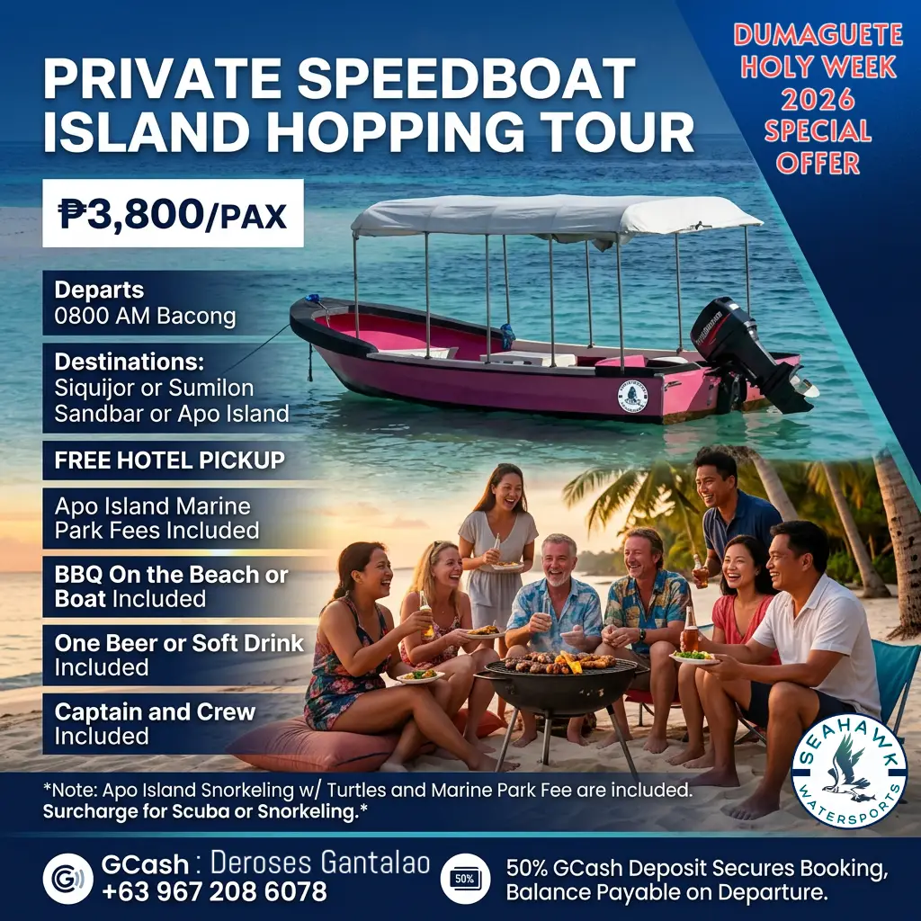 Seahawk Watersports invites Manila and Cebu’s most discerning travelers to experience an unforgettable private speedboat island-hopping adventure. Departing at 8:00 AM from Bacong, Negros Oriental, this tour is designed for those seeking pristine beauty and top-notch service.